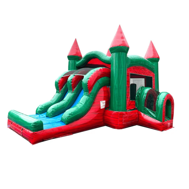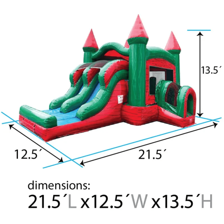 Bring twice the fun with this exciting inflatable combo that combines a roomy bounce area, two parallel slides, and built-in obstacles for nonstop action.
