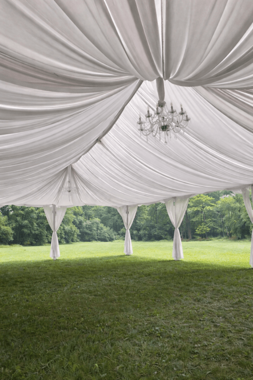 The draping is designed to gather at the center of the tent and extend gracefully toward the perimeter, creating a stunning focal point and a romantic atmosphere. This timeless look works perfectly for both daytime and evening events.