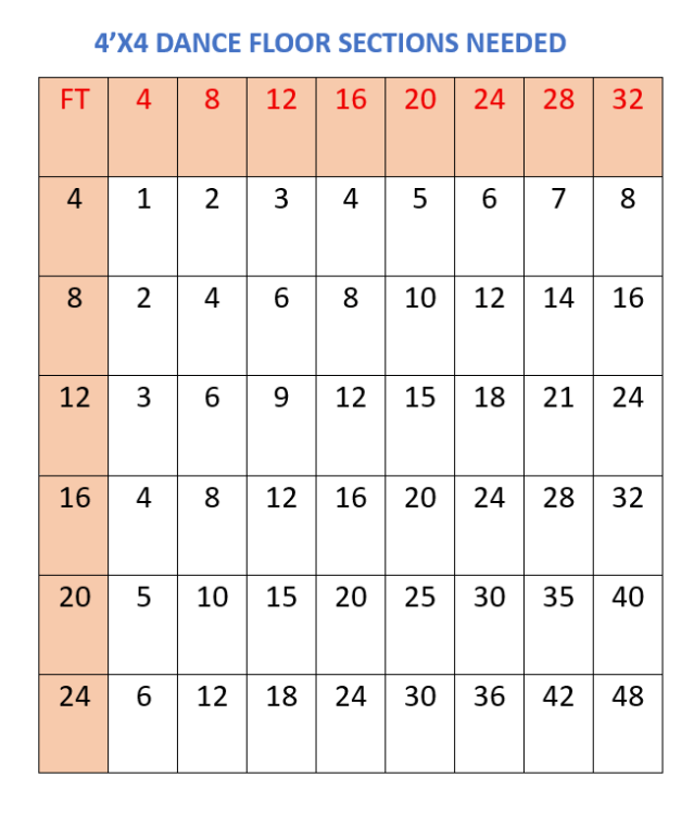 Please, taking into account the size chart, add the pieces you need to complete the desired dance floor size.